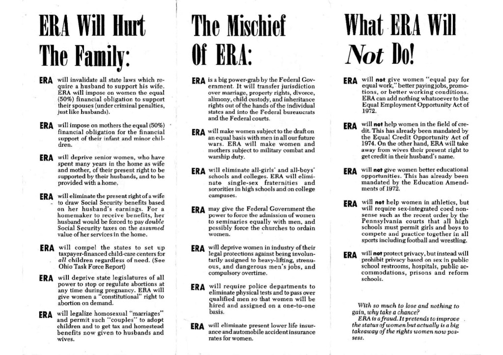 A pamphlet outlining the reasons women should oppose the passage of the ERA. Women Who Want To Be Women was affiliated with Phyllis Schlafly’s STOP-ERA campaign.