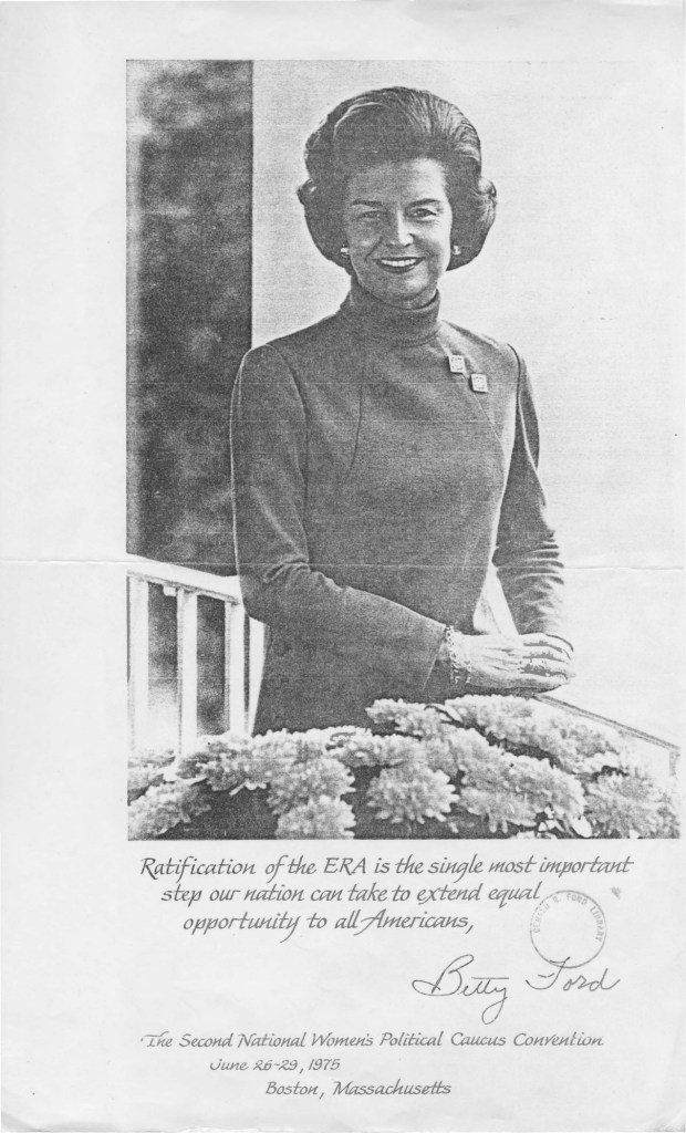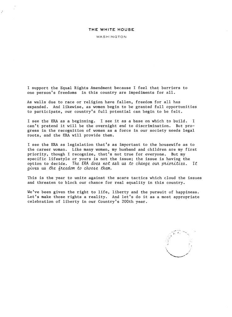 First Lady Betty Ford’s official statement in support of the ERA. Copies were distributed at the National Women’s Political Caucus Convention in Boston, MA.