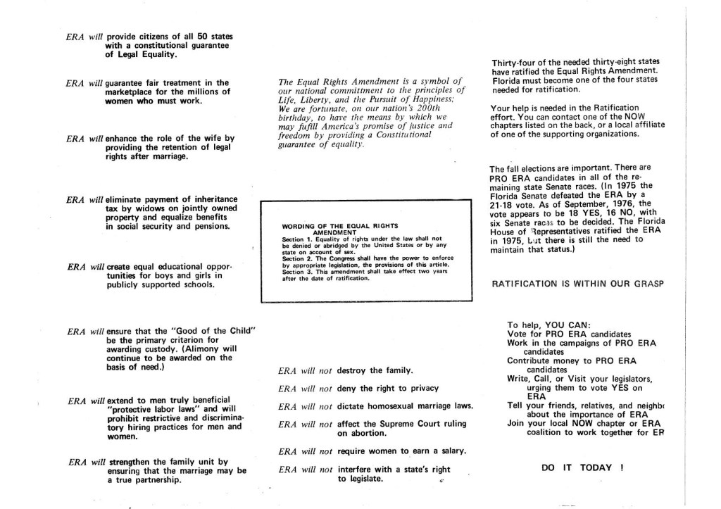 A pamphlet produced by the National Organization for Women explaining why Floridians should vote in favor of passing the ERA.