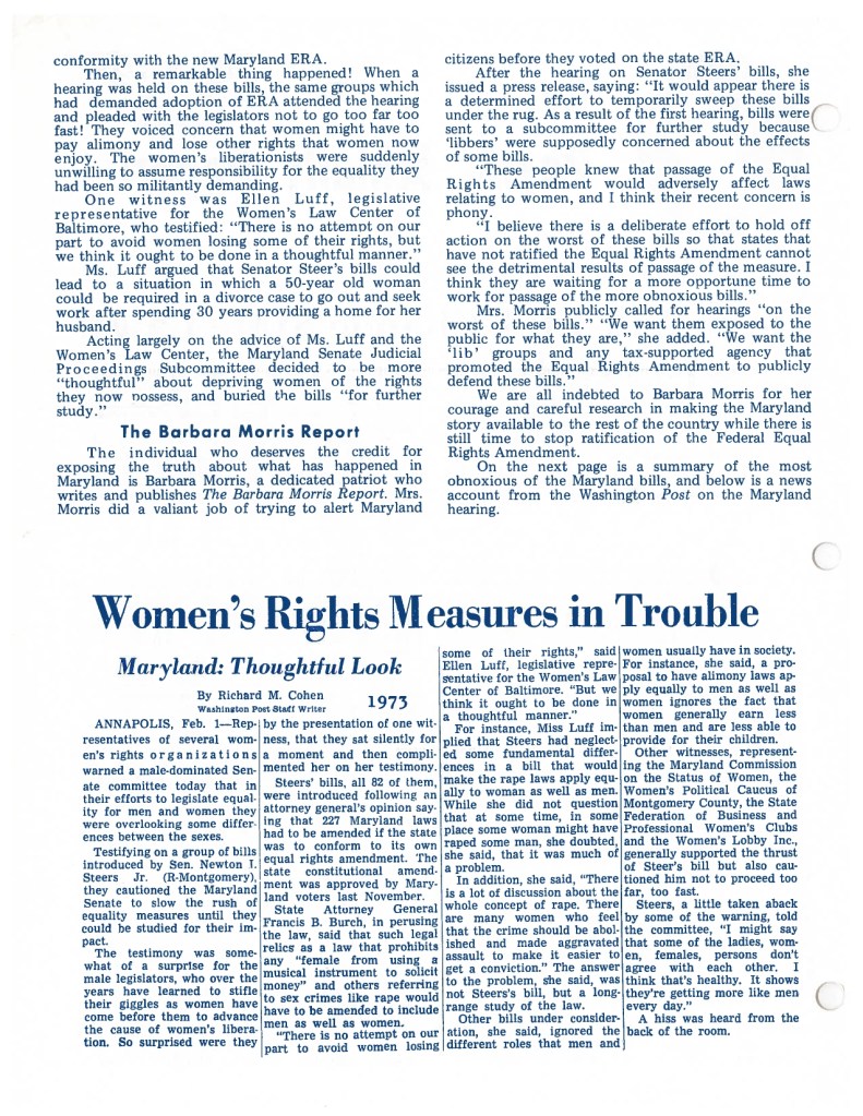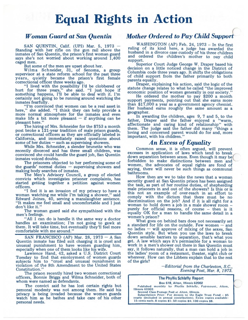 An issue of conservative activist Phyllis Schlafly’s monthly newsletter outlining the negative consequences of ERA legislation and current events related to the women’s liberation movement.