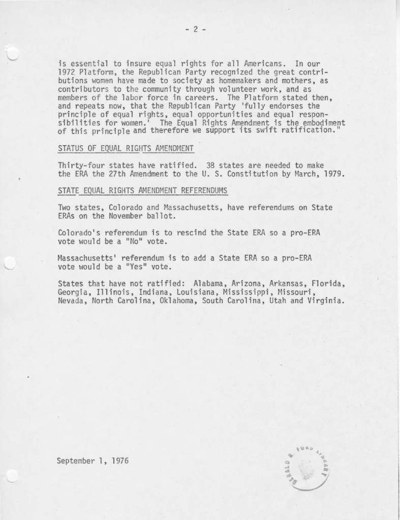 A statement from Gerald Ford detailing his support for the ERA. The document also describes the stance of the Democratic and Republican parties.