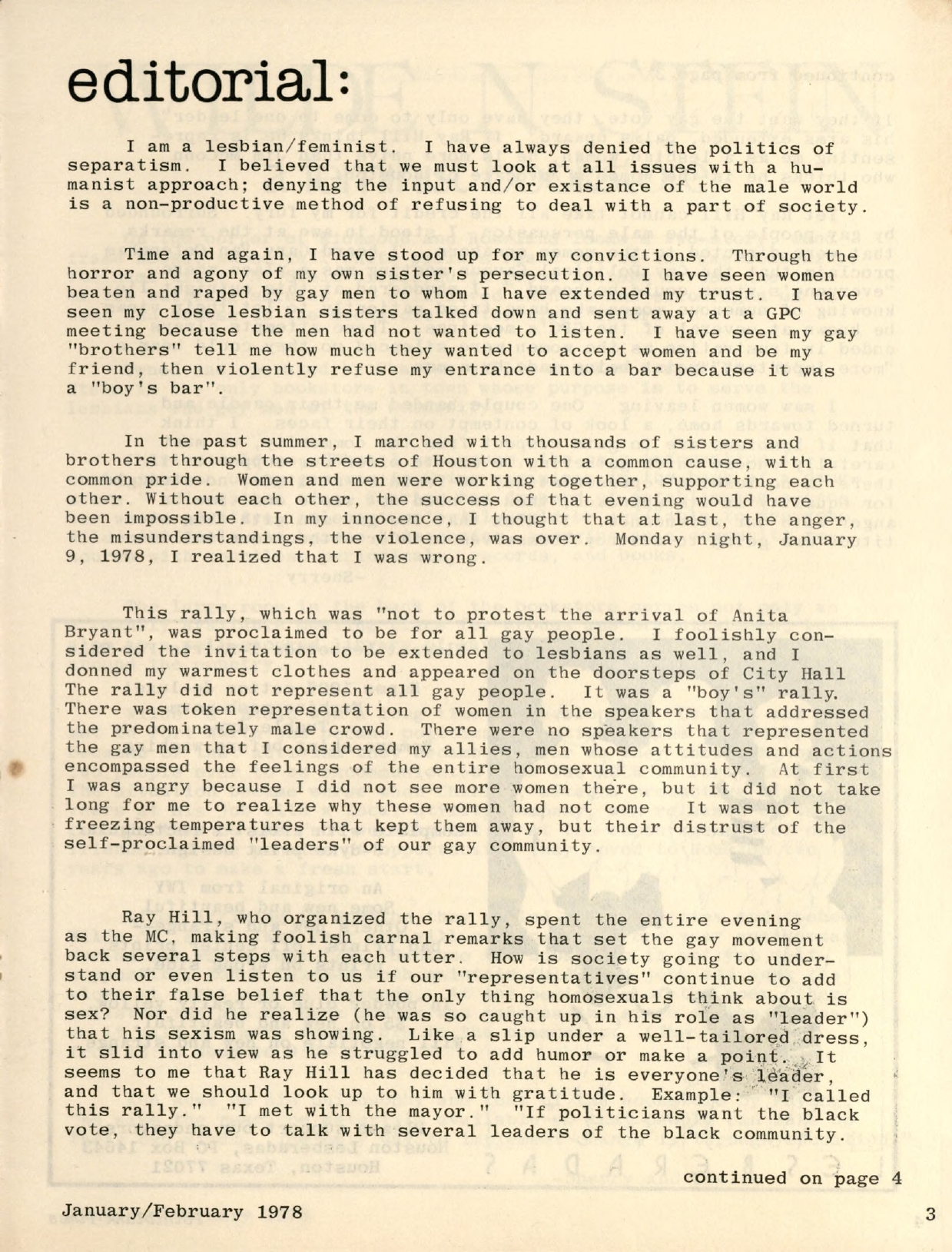 Editorial describing an Anita Bryant protest, The Pointblank Times, 1978